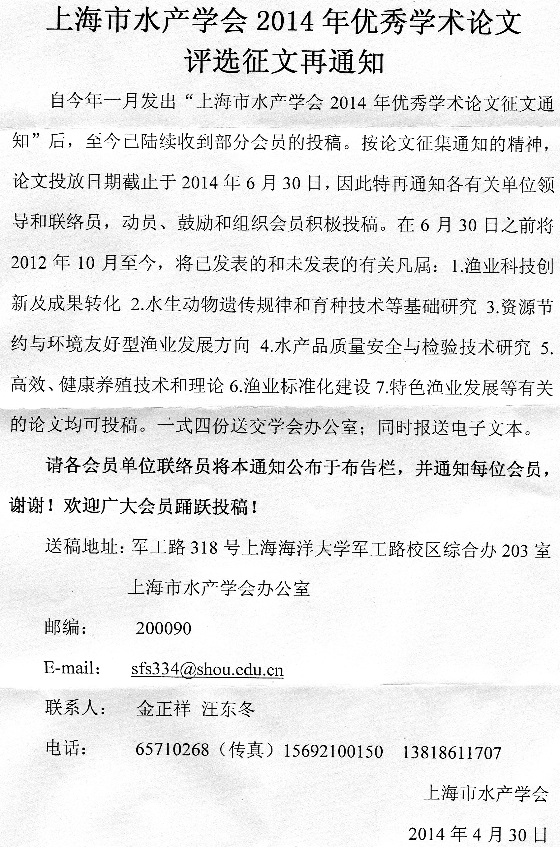 上海市水产学会2014年度优秀论文征文通知