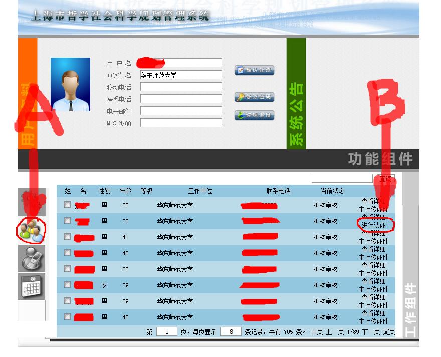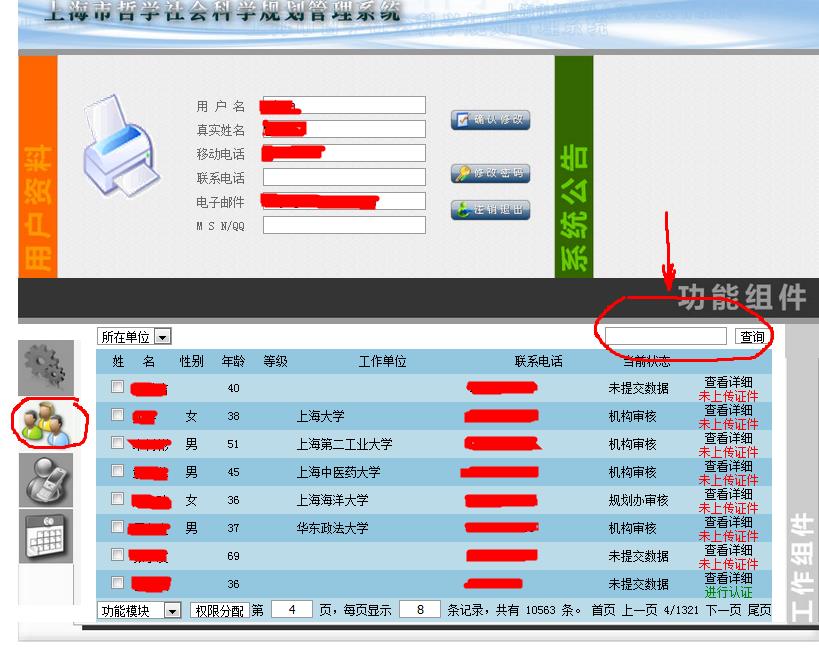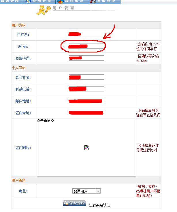 选择“查询”功能,点击查询结果页中专家信息的“认证信息”,即可在弹出页面看到所查找用户注册信息。操作程序类似实名认证审核过程。如下图: