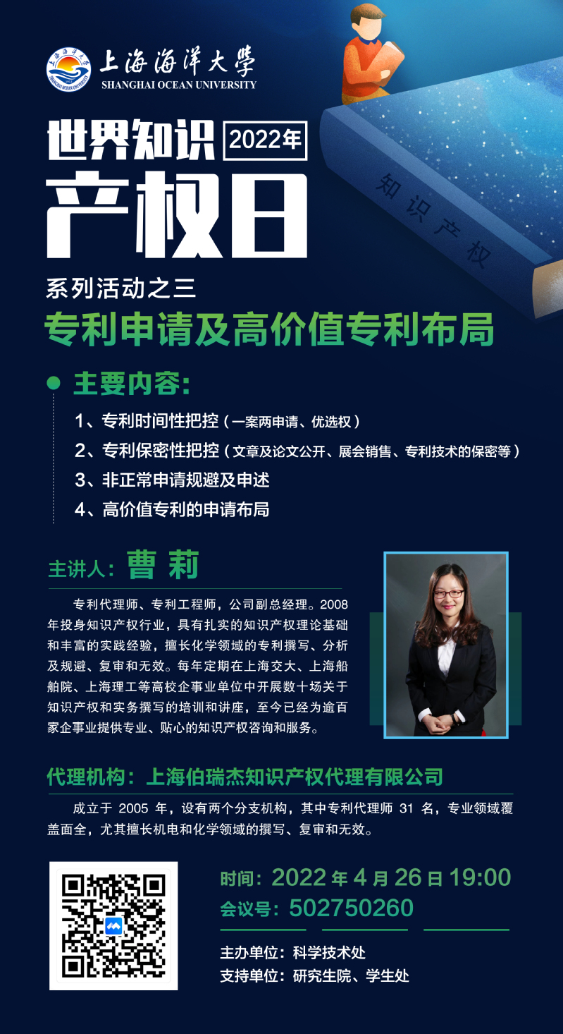 为深入贯彻落实习近平总书记关于知识产权工作的重要指示论述,响应上海市知识产权局的相关要求,增强全社会尊重和保护知识产权的意识,在第22个世界知识产权日来临之际,学校特邀入围专利代理机构,举办知识产权系列讲座,欢迎广大师生参加。有关事项通知如下: