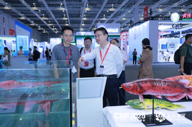 今年学校选取了智能仿生软体金龙鱼“金鳞”、用于消除水产品土腥味与品质提升的益生菌产品、绿奥金壮大®多功能型微生物菌剂(类球红细菌)、复合噬菌益生菌超微粉、果蔬品质快速评价技术及一体化智能装备、鸢乌贼活性肽助眠健康食品、跟着科学家去探海——海豆水下航行记、DOME大科学计划、一种姿态可调节的横卧式深远海养殖网箱、深远海浮式风浪流集成发电储电关键技术及创新应用、轴系扭振振动测试系统、工厂化养殖桶的智能清洗守护者等12个项目在工博会高校展区进行集中展示,项目涉及绿色养殖、深远海养殖、深海科技、海工装备、新一代信息技术、生物医药等多个领域。其中,海洋生物资源与管理学院研发的智能仿生金龙鱼“金鳞”项目荣获高校展区创新奖,学校荣获高校展区优秀组织奖。展会期间,教育部学位管理与研究生教育司副司长、国务院学位委员会办公室副主任,上海市教育委员会副主任(挂职)栾宗涛莅临我校展位指导工作。
